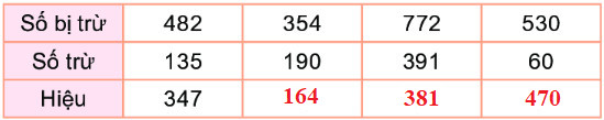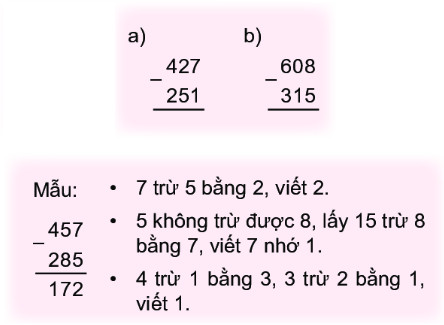 – Tính : Từ phải qua trái, lần lượt trừ hai số đơn vị, hai số chục và hai số trăm. Lưu ý trường hợp phép trừ có nhớ dạng mượn 1 chục.