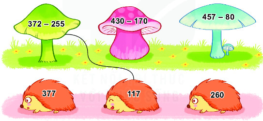 Thực hiện phép tính ghi trên mỗi cây nấm, sau đó đối chiếu kết quả với kết quả ghi trên mỗi chú nhím để tìm cây nấm cho mỗi bạn nhím.