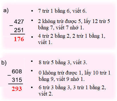 – Tính : Từ phải qua trái, lần lượt trừ hai số đơn vị, hai số chục và hai số trăm. Lưu ý trường hợp phép trừ có nhớ dạng mượn 1 chục.