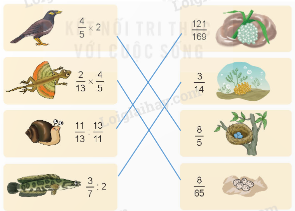 Thực hiện các phép tính nhân, chia phân số rồi nối với kết quả thích hợp