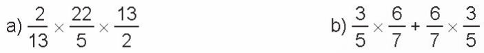 b) $\,\frac{3}{5} \times \frac{6}{7} + \frac{6}{7} \times \frac{3}{5} = \frac{3}{5} \times \left( {\frac{6}{7} + \frac{6}{7}} \right) = \frac{3}{5} \times \frac{{12}}{7} = \frac{{36}}{{35}}$
