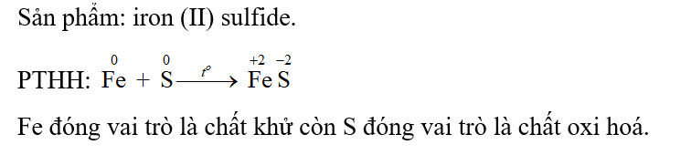 + Tính chất hoá học: khi tham gia phản ứng hoá học, sulfur có thể thể hiện tính oxi hoá hoặc tính khử. Trong thực tế, hầu hết các phản ứng của sulfur chỉ xảy ra khi đun nóng.