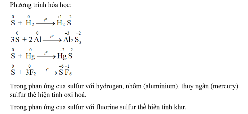 Phản ứng của sulfur với hydrogen, nhôm (aluminium), thủy ngân (mercury) và fluorine, hãy xác định sự thay đổi số oxi hóa của nguyên tử các nguyên tố. Sulfur là chất oxi hóa hay chất khử?