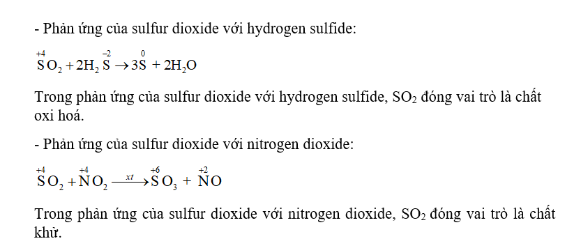 + Tính chất hoá học: khi tham gia phản ứng hoá học, sulfur dioxide thể hiện tính chất của acidic oxide. Ngoài ra, sulfur dioxide còn thể thể hiện tính oxi hoá hoặc tính khử.