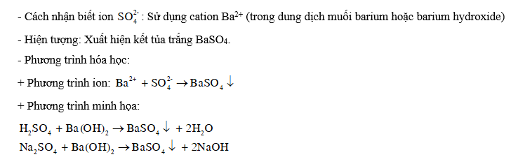 – Cách nhận biết ion : Sử dụng cation Ba2+ (trong dung dịch muối barium hoặc barium hydroxide).