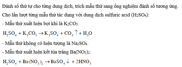 Cho các dung dịch không màu của mỗi chất sau: K2CO3, Na2SO4, Ba(NO3)2. Hãy trình bày cách phân biệt các dung dịch đã cho bằng phương pháp hoá học. Viết phương trình hoá học của các phản ứng xảy ra.