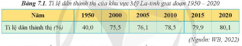 + Tỉ lệ dân thành thị liên tục tăng (năm 2020 là 80,1%), U-ru-goay có tỉ lệ dân thành thị cao nhất (95,5%). Ba đô thị đông dân nhất khu vực là: Bu-ê-nốt Ai-rét (15,2 triệu người), Mê-hi-cô Xi-ti (21,8 triệu người), Xao-pao-lô (22 triệu người).