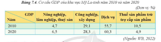 Dựa vào bảng 7.4, vẽ biểu đồ thể hiện cơ cấu GDP của khu vực Mỹ La-tinh năm 2010 và năm 2020. Nhận xét sư thay đổi về GDP của khu vực Mỹ La-tinh.