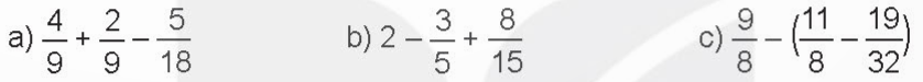 a) \(\;\frac{4}{9}{\text{ + }}\frac{2}{9} – \frac{5}{{18}}{\text{ = }}\frac{6}{9} – \frac{5}{{18}} = \frac{{12}}{{18}} – \frac{5}{{18}} = \frac{7}{{18}}\)