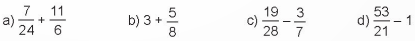 a) \(\frac{7}{{24}} + \frac{{11}}{6} = \frac{7}{{24}} + \frac{{44}}{{24}} = \frac{{51}}{{24}} = \frac{{17}}{8}\)