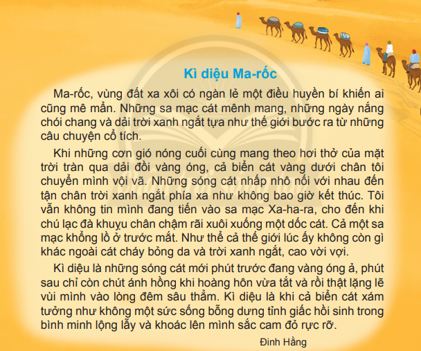 Nói những điều em biết về sa mạc. Điều gì gợi cho tác giả cảm giác Ma-rốc như một “thế giới bước ra từ những câu chuyện cổ tích”. Nắng, cát và bầu trời xứ Ma-rốc được miêu tả như thế nào trong đoạn 2? Tác giả cảm nhận được những điều kì diệu gì khi đến Ma-rốc. Bức tranh Ma-rốc trong bài được tả bằng những màu sắc nào. Nhận xét về cách tác giả sử dụng từ ngữ chỉ màu sắc.
