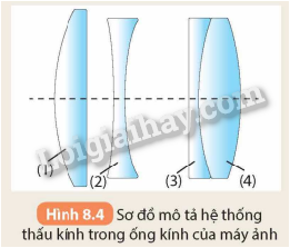 2. Ống kính máy ảnh có cấu tạo gồm nhiều thấu kính nhằm mục đích để thu được hình ảnh chất lượng rõ nét. Hình 8.4 mô tả hệ thống gồm các thấu kính ((1), (2), (3), (4)) trong ống kính của một máy ảnh. Hãy chỉ rõ đâu là thấu kính hội tụ và đâu là thấu kính phân kì trong hệ thống này.
