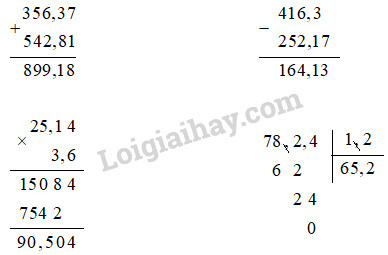 Đặt tính rồi tính theo các quy tắc đã học về phép cộng, trừ, nhân, chia hai số thập phân.