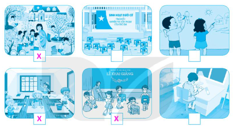 Hãy đánh dấu x vào □ dưới hình thể hiện việc em nên làm để giữ trường học luôn sạch đẹp.
