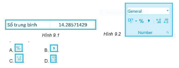 Quan sát số trung bình có nhiều chữ số sau dấu phẩy ở Hình 9.1. Nếu muốn giảm bớt số chữ số sau dấu phẩy em chọn nút lệnh nào sau đây trong nhóm lệnh Number của thẻ Home (Hình 9.2)