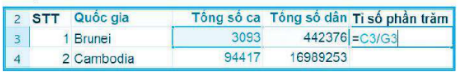 b) Tính tỉ số phần trăm tổng số ca nhiễm bệnh trên tổng số dân vào cột Tỉ số phần trăm cho các ô và định dạng cho phù hợp.