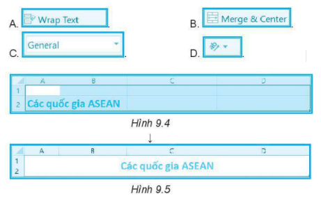 Để tiêu đề của bảng ở Hình 9.4 được căn giữa như Hình 9.5, em chọn các ô cần căn rồi chọn lệnh nào sau đây