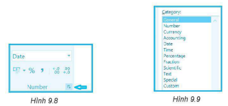 Theo em bạn Minh cần chọn tiếp mục nào ở hộp Category (Hình 9.9) để định dạng ô dữ liệu ngày tháng?