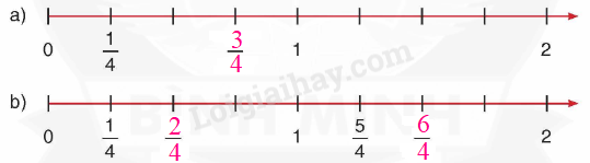 Hai vạch chia liền nhau trên tia số cách nhau $\frac{1}{4}$ đơn vị. Từ đó em xác định các phân số còn thiếu.