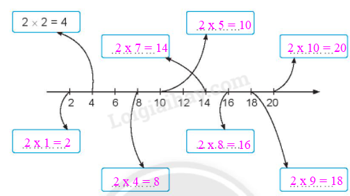 Viết các phép tính trong bảng nhân 2 vào ô trống sao cho kết quả của phép tính đó tương ứng với các vạch trên tia số.