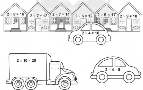 Quan sát tranh, em tính nhẩm dựa vào bảng nhân 2 và tô màu các ngôi nhà và xe ô tô có phép tính đúng.