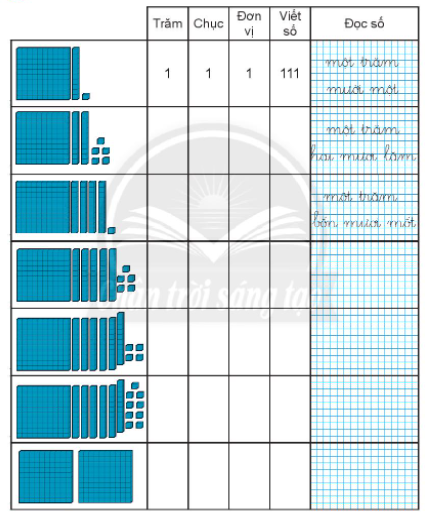 Xác định số hình vuông nhỏ từ đó em biết được các trăm, chục, đơn vị, viết số và đọc số tương ứng.
