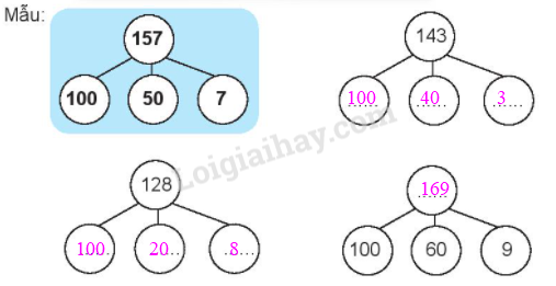 Quan sát ví dụ mẫu ta nhận thấy mỗi số hàng trên bằng tổng của 3 số ở hàng dưới. Từ đó em viết tiếp các số còn thiếu vào ô trống.