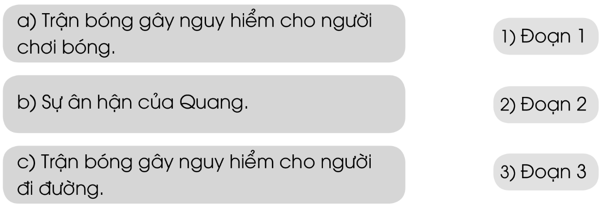 Nối mỗi ý ở bên A với đoạn văn phù hợp ở bên B. Vì sao Quang cảm thấy ân hận. Gạch dưới những chi tiết thể hiện sự ân hận của Quang. Em có đồng tình với hành động chơi bóng trên đường phố không. Qua câu chuyện, em rút ra bài học gì? Khoanh tròn chữ cái trước ý em thích. Gạch chân dưới những từ ngữ hoặc câu văn được đánh dấu bằng dấu ngoặc kép. Điền dấu ngoặc kép vào những vị trí phù hợp trong truyện vui dưới đây.
