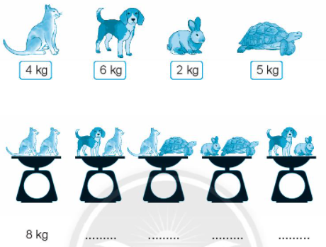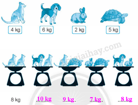Quan sát tranh, em xác định cân nặng mỗi loại con vật đã cho rồi tính tổng cân nặng hai con vật trong bức tranh.