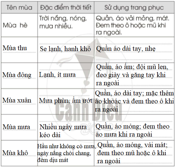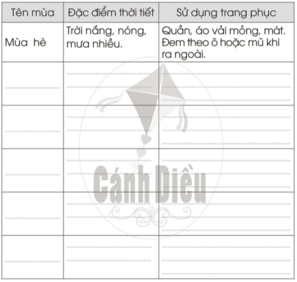 Dựa vào kiến thức đã học về các mùa xuân, hè, thu, đông hay mùa mưa, khô để hoàn thành bài tập.