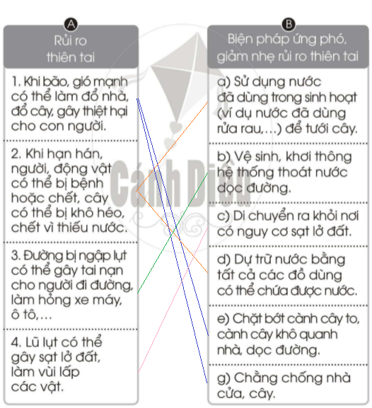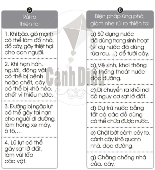 Nối những rủi ro thiên tai (cột A) tương ứng các biện pháp ứng phó, giảm nhẹ rủi ro (cột B).