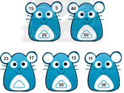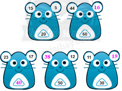 Quan sát ví dụ mẫu ta thấy tổng hai số ghi trên tai chuột bằng số ở giữa, từ đó ta điền các số còn thiếu vào chỗ chấm.