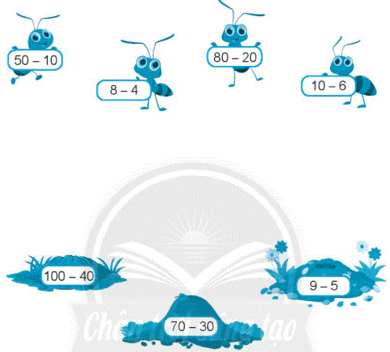 Nối các phép tính có kết quả bằng nhau để tìm tổ cho các bạn kiến.