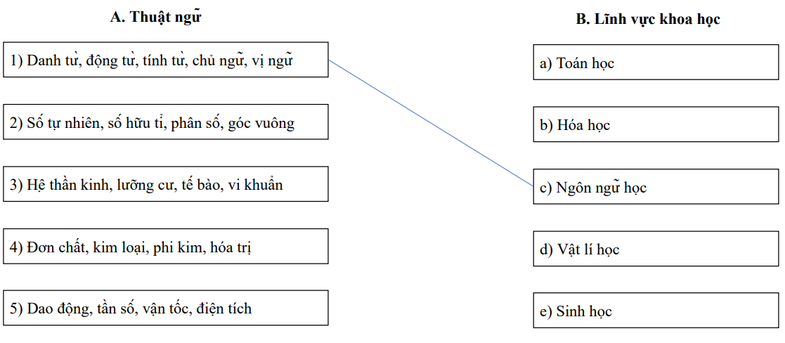 Xem xét nghĩa của các từ trong những câu đã cho để xác định các từ là thuật ngữ, sau đó đối chiếu các thuật ngữ tìm được với các lĩnh vực khoa học