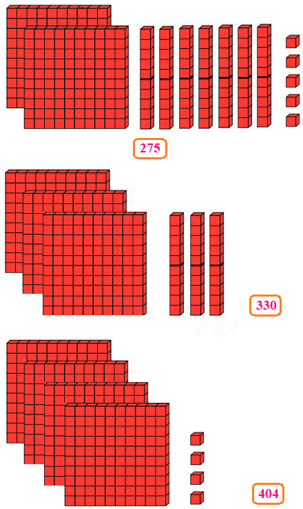 Xác định số trăm, số chục, số đơn vị của mỗi số 275, 330, 404 rồi lấy các thẻ trăm, thẻ chục và hình lập phương nhỏ tương ứng để biểu diễn các số đó.