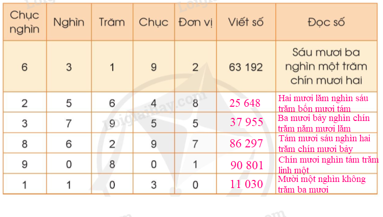 Viết số hoặc đọc số lần lượt từ hàng chục nghìn, nghìn, trăm, chục, đơn vị.