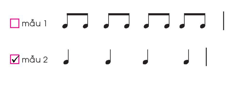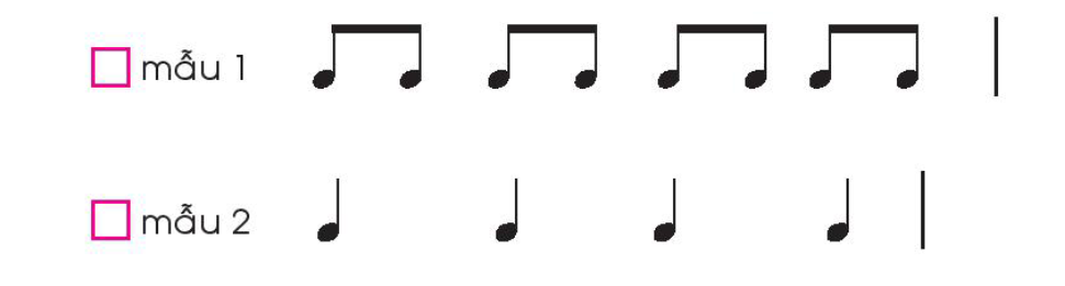 Em hãy gõ các mẫu tiết tấu dưới đây bằng nhạc cụ mà em thích và đánh dấu tích vào ô trống trước mẫu tạo ra âm thanh chậm hơn.