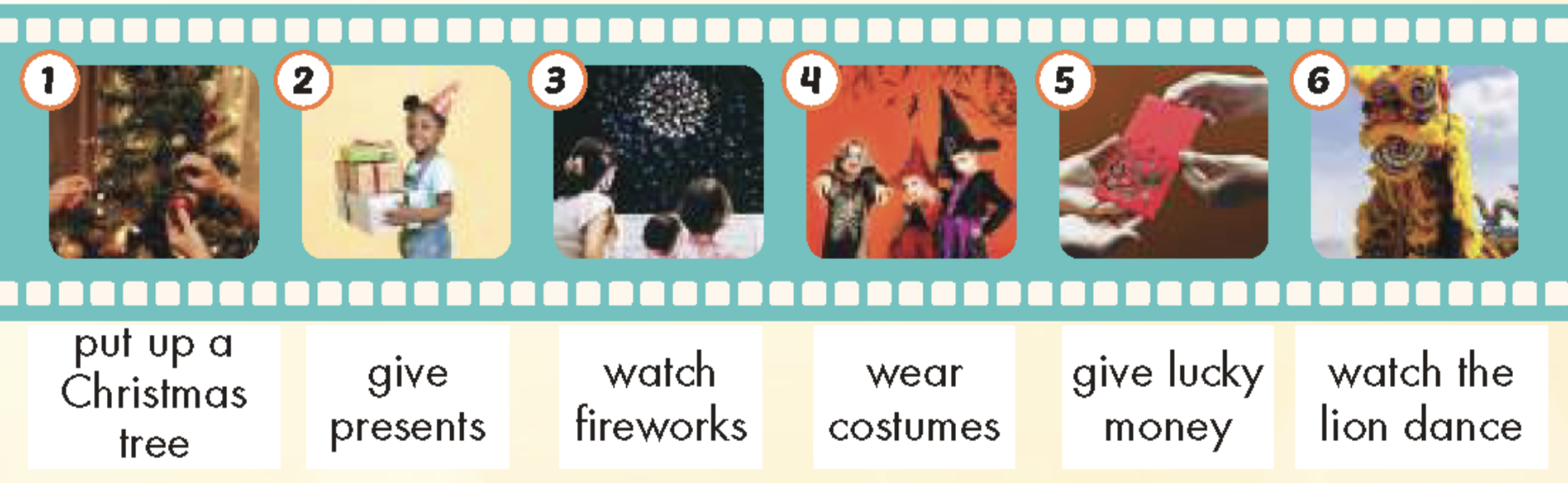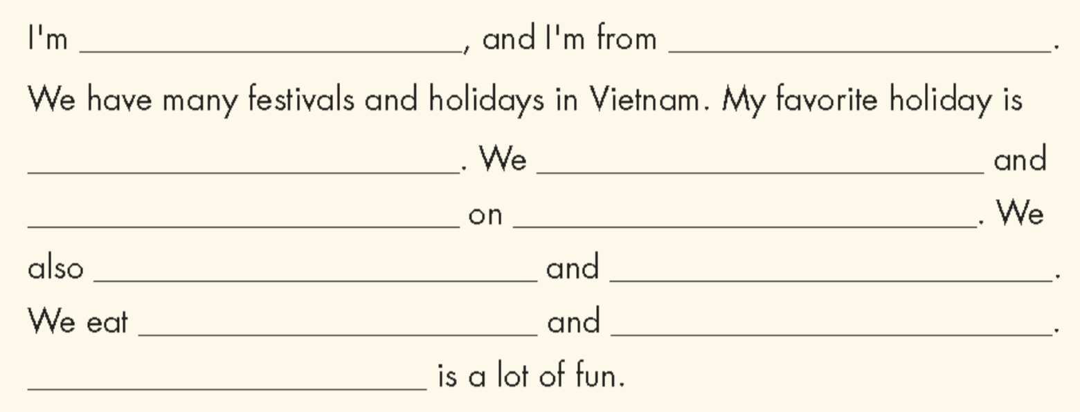 I’m Nghi, and I’m from Vietnam. We have many festivals and holidays in Vietnam, but my favorite holiday is Lunar New Year. It’s usually in January or February, and I don’t go to school for a week. We clean our houses and put up red paper to celebrate Lunar New Year. Red is a lucky color in Vietnam. On Lunar New Year, everyone wears new clothes. Lucky money is my favorite part of Lunar New Year. Kids get lucky money from their parents and grandpar ents. Kids also watch the lion dance and eat lots of cookies and candy. Lunar New Year is a lot of fun.