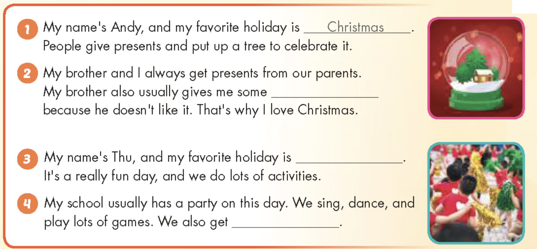 1. My name’s Andy, and my favorite holiday is Christmas. People give presents and put up a tree to celebrate it.