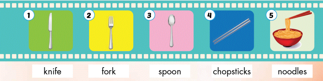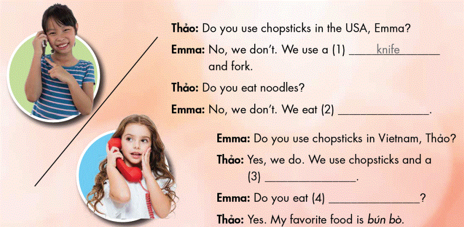 Emma: No, we don’t. We use a (1) knife and fork. (Mình không. Chúng mình dùng dĩa và dao.)