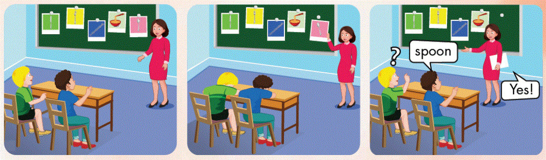 Cách chơi: Cô sẽ dán thẻ có hình về chủ đề các đồ vật liên quan đến ăn uống và đồ ăn (ví dụ: knife, fork, chopsticks, spoon …) lên bảng, các bạn nhìn qua một lượt và ghi nhớ có những hình nào. Cô sẽ lấy đi bất kì một thẻ nào, các bạn dưới lớp úp mặt xuống bàn và không được nhìn lên bảng. Khi cô đã hoàn thành và hỏi thẻ hình nào bị thiếu thì các bạn mới ngẩng đầu lên, nhìn lên bảng và trả lời nhanh.
