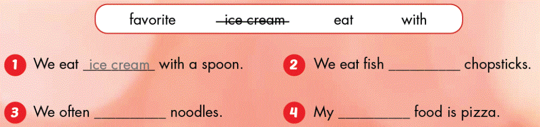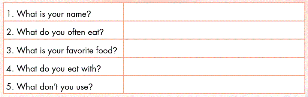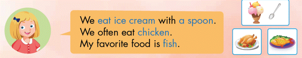 A. 1. Listen and point. Repeat. 2. Play Heads up. What's missing? B. 1. Listen and practice. 2. Look and write. Practice. C. Read and circle. D. 1. Look and listen. 2. Listen and write. 3. Practice with your friends. E. Read and circle True or False. F. 1. Write about you. 2. Look at E. Now write about eating in your house. Write 10 – 20 words. G. Talk about your favorite food.