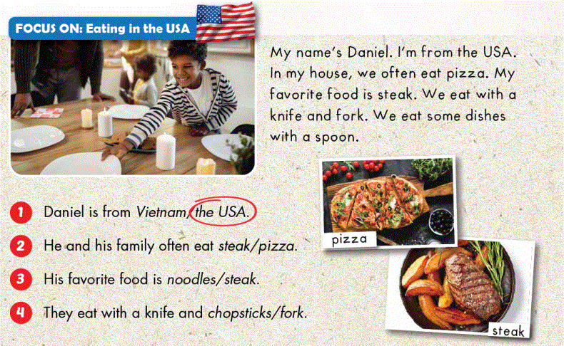 Tên của tôi là Daniel. Tôi đến từ nước Mĩ.Trong nhà tôi, chúng tôi thường ăn bánh pi-za. Đồ ăn yêu thích của tôi là bít tết. Chúng tôi ăn bằng dao và nĩa. Chúng tôi ăn một số món ăn bằng muỗng.