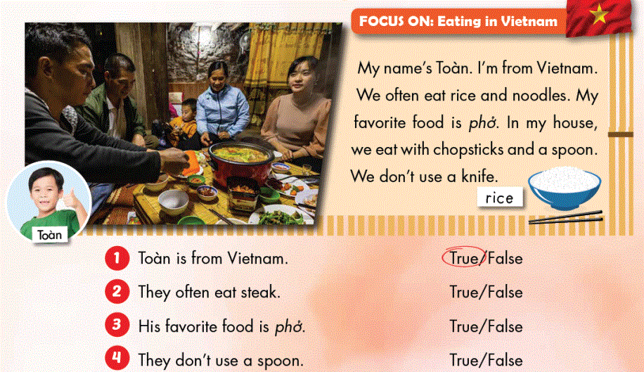Tên của tôi là Toàn. Tôi đến từ Việt Nam. Chúng tôi thường ăn cơm và mì. Đồ ăn yêu thích của tôi là phở. Ở trong nhà tôi, chúng tôi ăn bằng đũa và muỗng. Chúng tôi không dùng dao.
