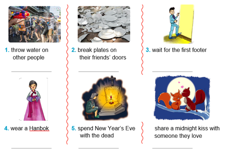 (Ghép các hoạt động năm mới với các quốc gia trong hộp. Hãy đoán nếu bạn không biết.)