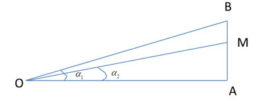 \(\begin{array}{l}\tan \angle MOB = \tan ({\alpha _1} – {\alpha _2}) = \frac{{\tan {\alpha _1} – \tan {\alpha _2}}}{{1 + \tan {\alpha _1}\tan {\alpha _2}}}\\ = \frac{{\frac{9}{d} – \frac{{4,5}}{d}}}{{1 + \frac{9}{d}.\frac{{4,5}}{d}}} = \frac{{4,5}}{{d + \frac{{81}}{{2d}}}}\end{array}\)