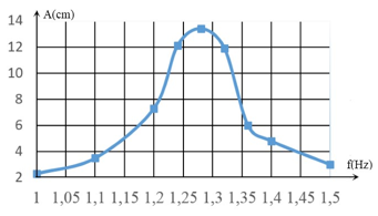 Khi $f$ nằm trong khoảng từ \(1,25Hz\)  đến \(1,3Hz\)  thì biên độ cực đại, khi đó xảy ra cộng hưởng.