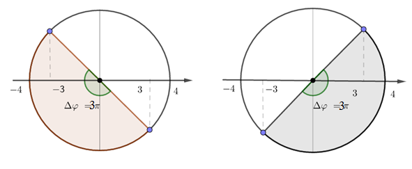 \(\Delta \varphi  = \omega \Delta t = \dfrac{\pi }{2}6= {3\pi }\)