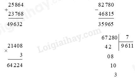 25 864 + 23 768                    82 780 – 46 815                    21 408 x 3                  67 280 : 7