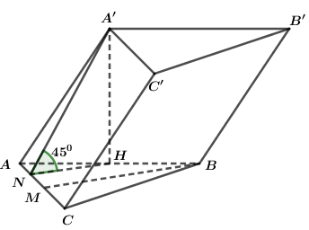 Câu 39. Cho hình lăng trụ \(ABC.A’B’C’\) có đáy \(ABC\) là tam giác đều cạnh bằng \(a\). Hình chiếu của điểm \(A’\) trên mặt phẳng \(\left( {ABC} \right)\) là trung điểm của đoạn thẳng \(AB\). Mặt bên \(\left( {AA’C’C} \right)\) tạo với đáy một góc bằng \({45^0}\). Thể tích của khối lăng trụ \(ABC.A’B’C’\) bằng